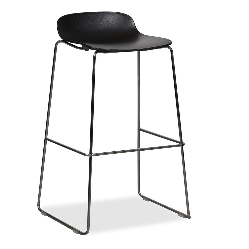 Let barstol fra DUBA B8, model Molo. Stolens sæde er udført i sort plast og stellet står i krom.
