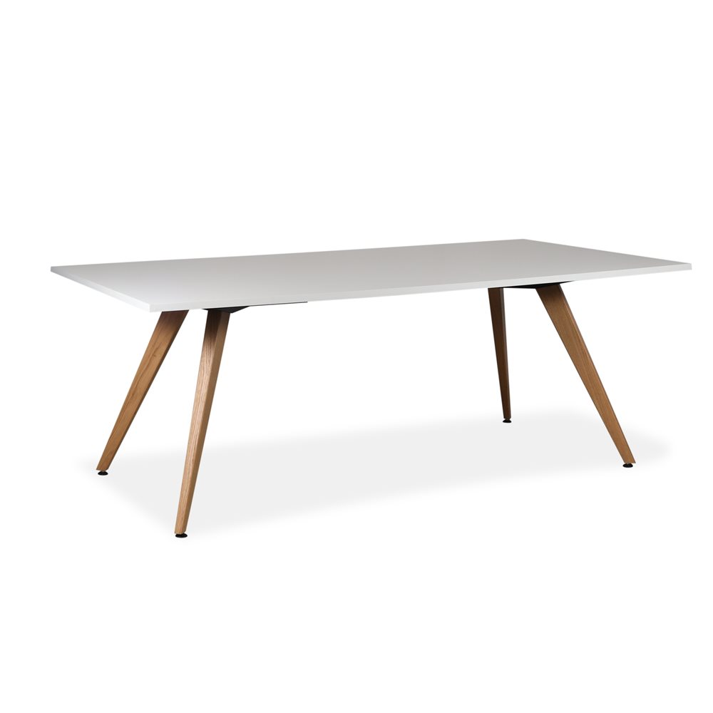 Flot konferencebord fra HOLMRIS B8, model Cabale. Bordet har ben i massiv eg og bordplade i hvid laminat.