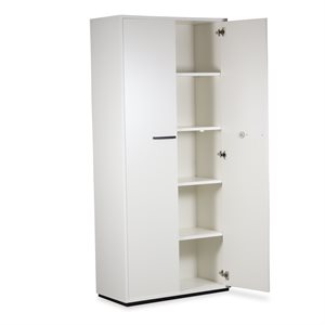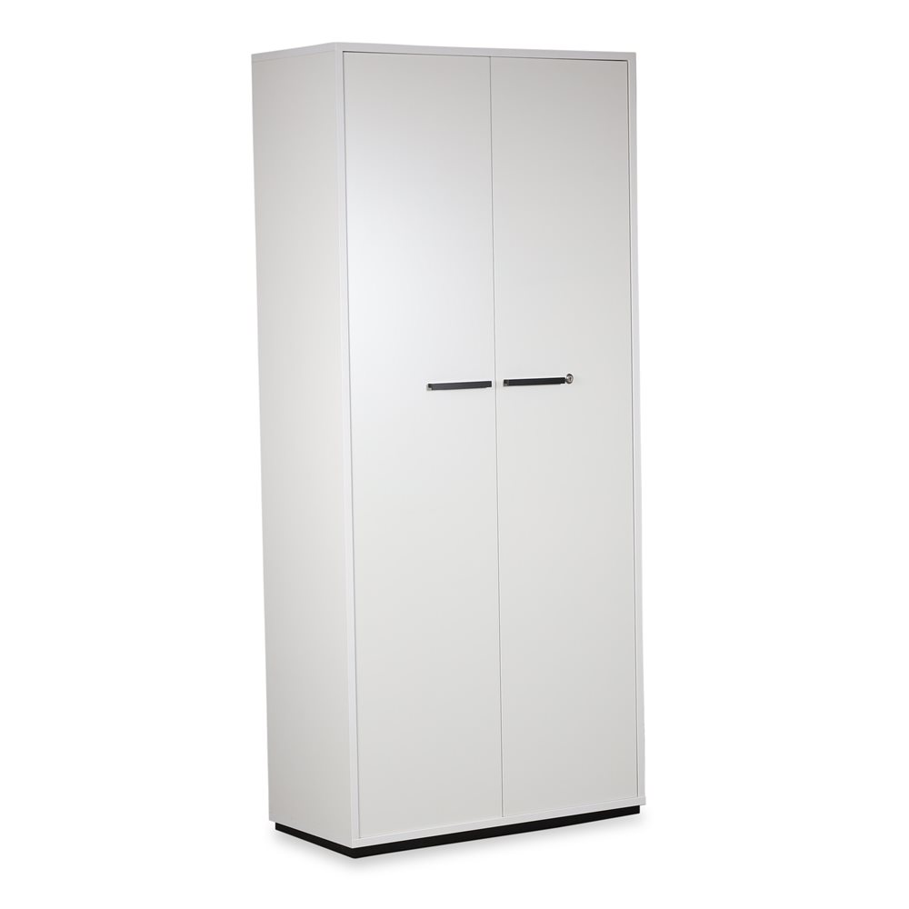 Kontorskab fra HOLMRIS B8, model Urban. Skabet er udført i hvid laminat og har 2 låger med sorte greb. Skabet har lås og nøgle medfølger. Skabet er inddelt i 5 rum.