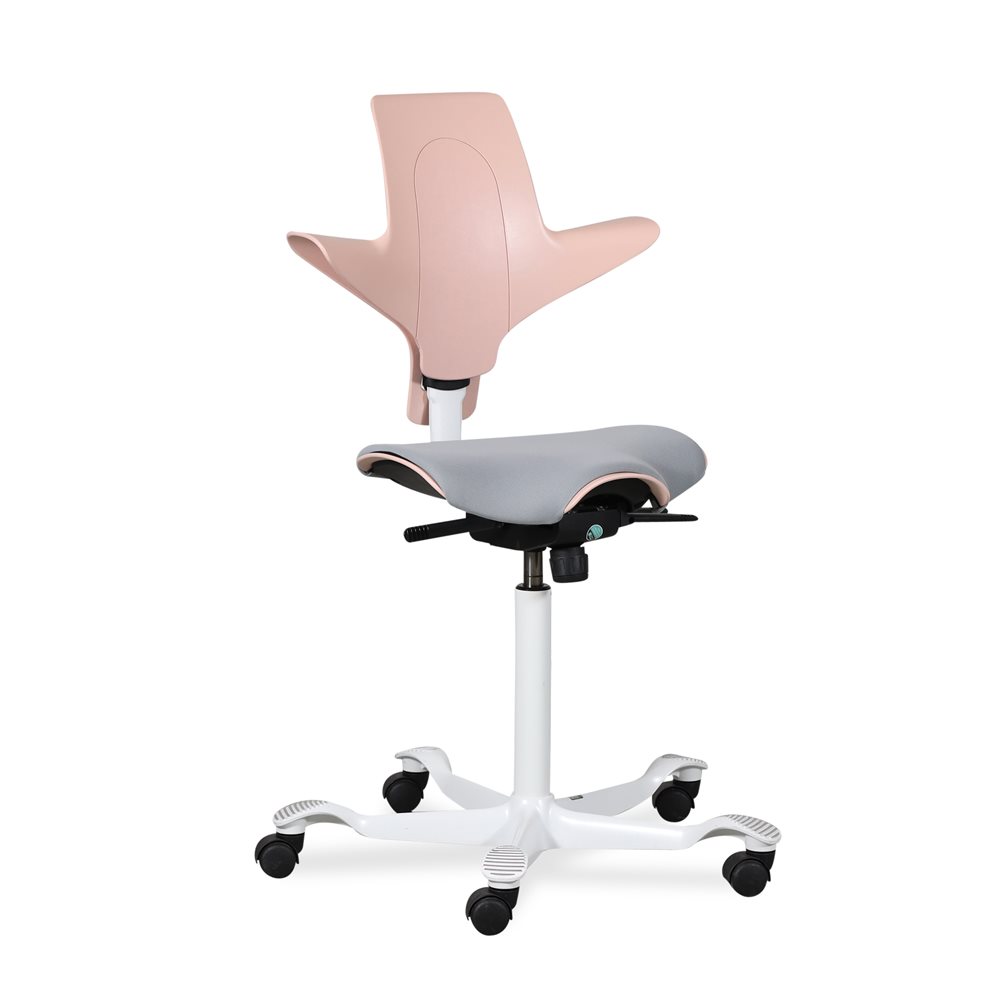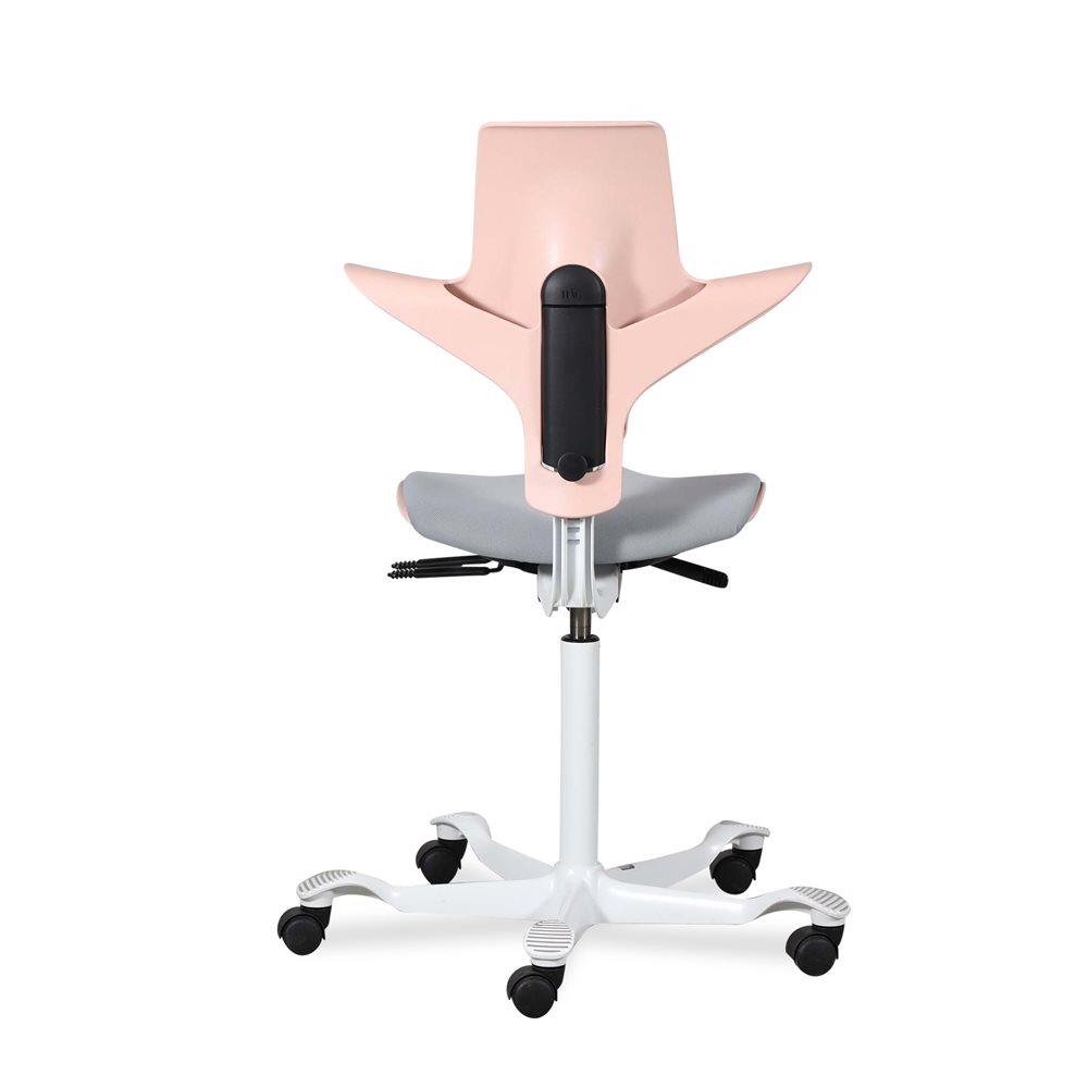 Kontorstol. Håg. Capisco 8020. Hvidt stel. Lyserød. Gråt polster. 265 mm.