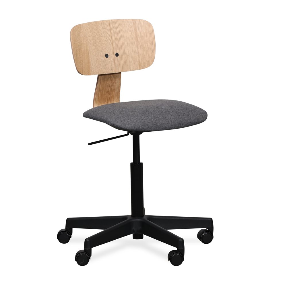 Flot kontorstol fra HOLMRIS B8, model JABA. Stolens ryg er udført i egetræ og sædet er polsteret i Step Melange 60011 fra Gabriel. Stolen er tegnet af Hans Thyge & Co for HOLMRIS B8.