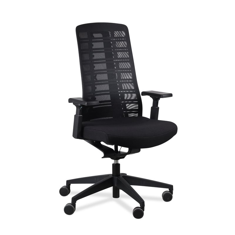Flot kontorstol fra Interstuhl med god siddekomfort. Kontorstolen står med sort mesh, sort polster og sorte armlæn.