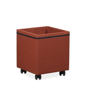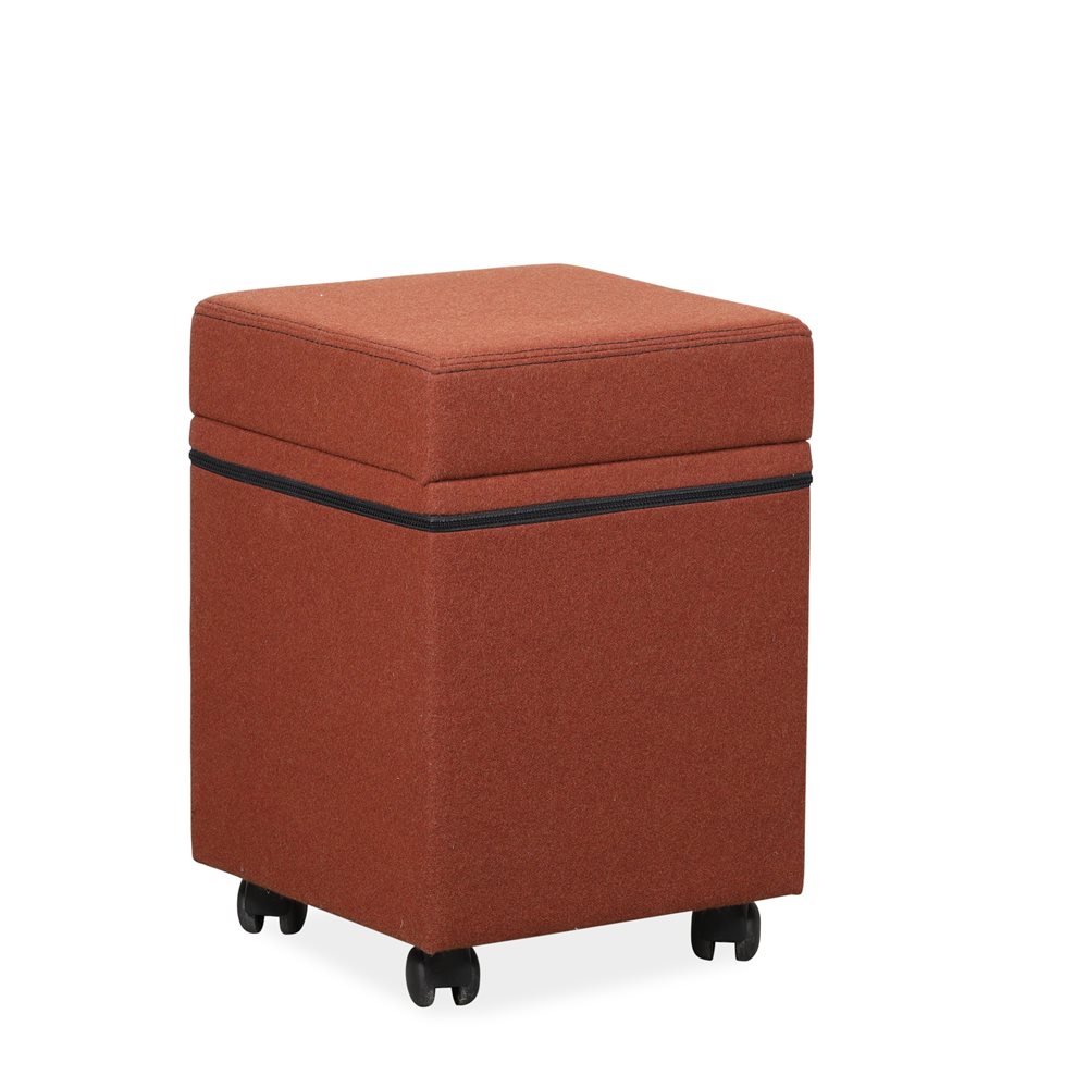 Fin lille puf på hjul fra Götessons. Puffen er polsteret i rustrød uld stof og sædet kan tages af, så er der opbevaringsrum inde i puffen.