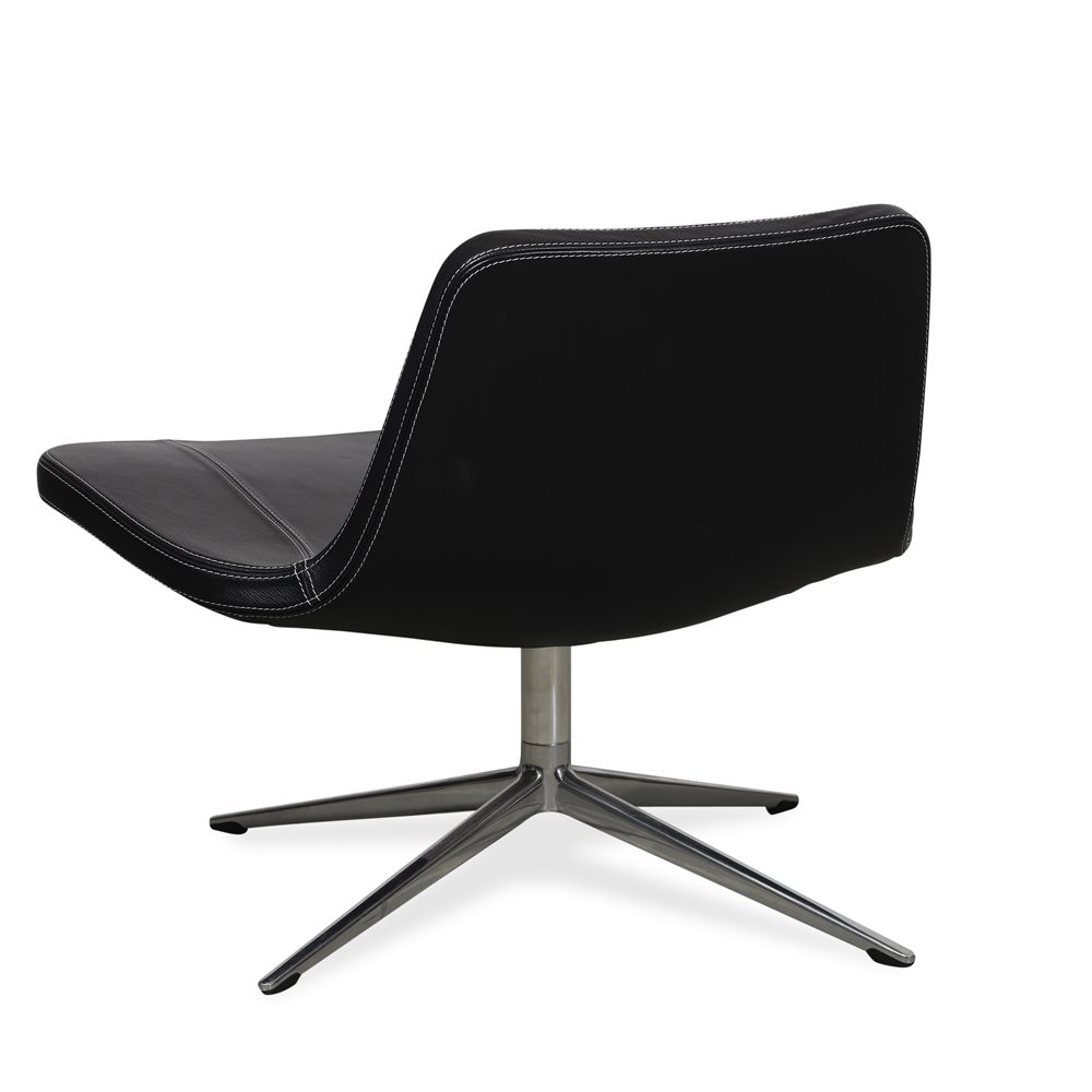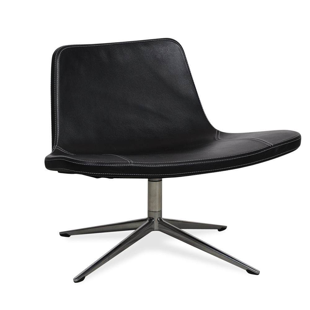 Loungestol fra HAY, model RAY med swivel stel. Loungestolen står i sort læder med hvide syninger.