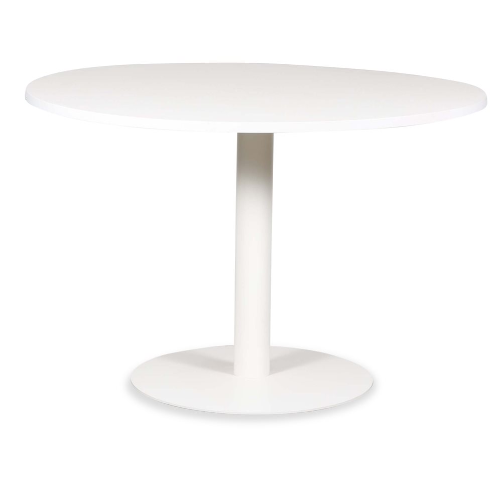Mødebord. Råhvid lakeret med synlig træstruktur. Hvid søjle. Ø: 110cm.